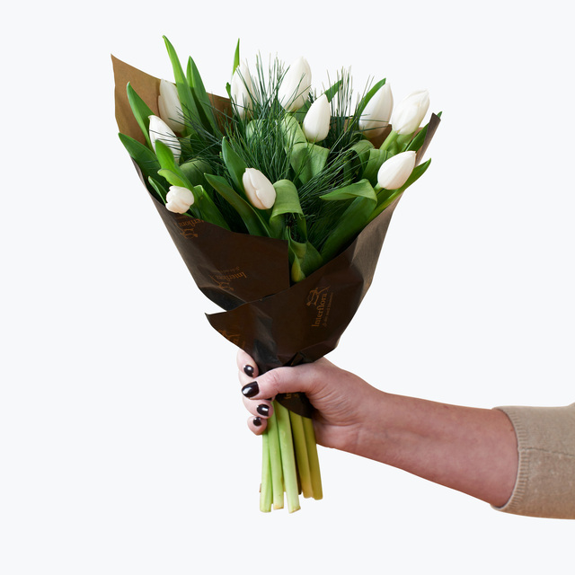 Knitrende hvite juletulipaner og vintergrønt. En hyggelig hilsen til den du vil vise omtanke. Kommer i knopp ved levering. Vis mer